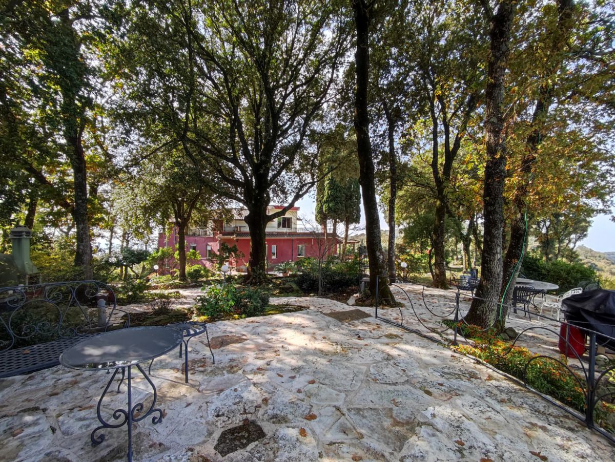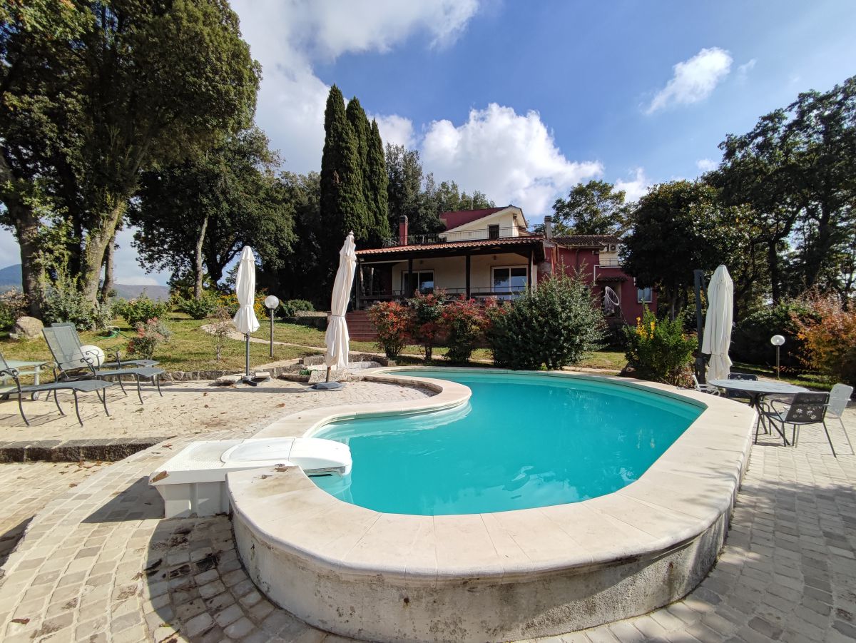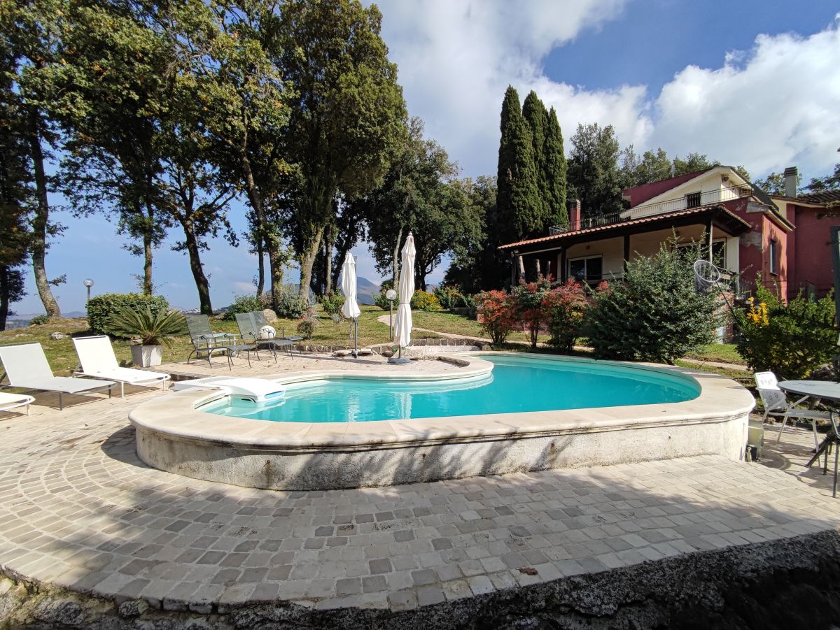 Questa splendida dimora sorge a sud delle porte di Roma, immersa in un parco di lecci secolari di 2800 mq circa con piscina.